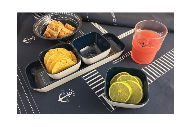 Set Snack composto por 3 tigelas e bandeja, design bonito.