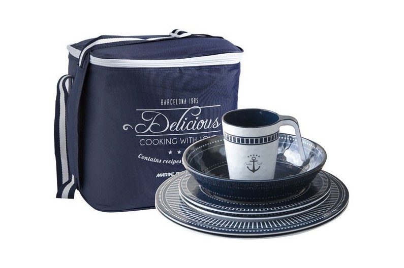 Conjunto de 24 peças, incluindo: 6 pratos rasos, 6 pratos fundo, 6 pratos de sobremesa, 6 taças e saco de transporte.